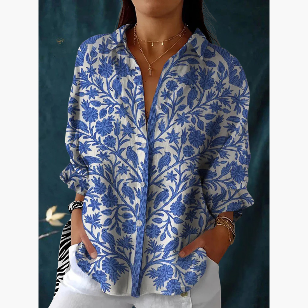 Frederikke | Blue Garden Blouse brings timeless beauty to your wardrobe with its detailed floral and bird motif in striking blue tones against a soft cream base. Elegant yet versatile, it’s perfect for both casual and semi-formal occasions, offering a chic look that never goes out of style.