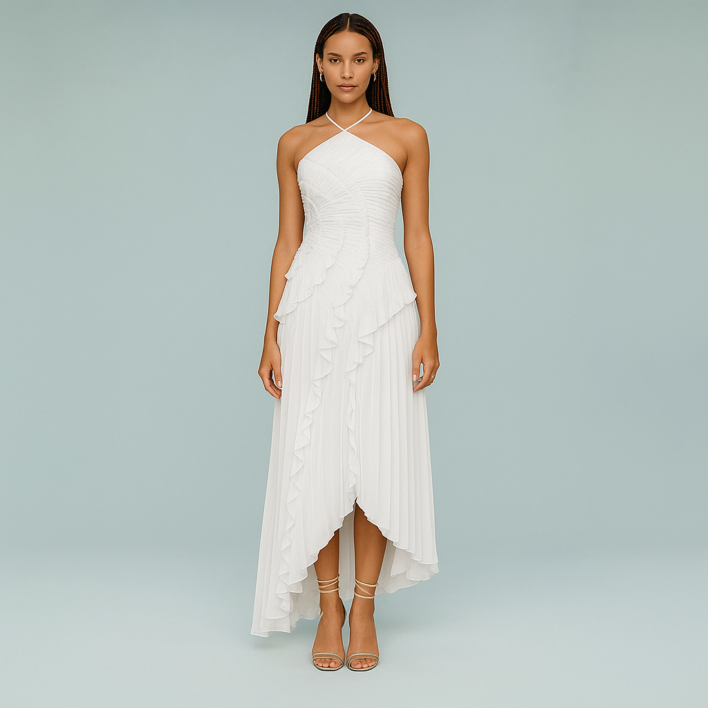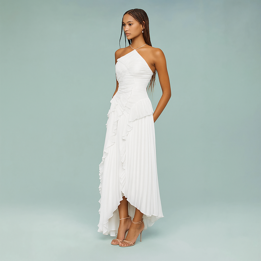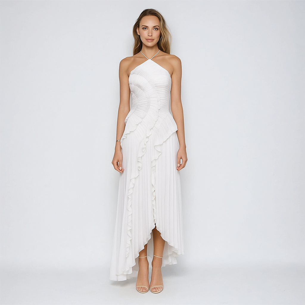 Artful Details: Flowing ruffles inspired by water lilies, sculpted drapery on the bodice, and an asymmetrical hem create a sculptural finish that’s soft yet memorable .